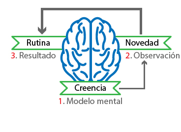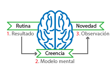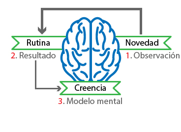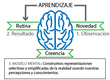 En el proceso de aprendizaje se confronta la novedad en el hemisferio derecho del cerebro, la cual se convierte en rutina en el hemisferio izquierdo, formando creencias nuevas que sustituyen a las viejas. El aprendizaje es un proceso continuo de generación de creencias que se transforman en los modelos mentales que guían nuestra conducta y se refuerza continuamente a través de la retroalimentación.