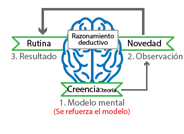 Se infiere por razonamiento deductivo cuando se desea aplicar una teoría ya probada a un problema novedoso. ¿La receta sirve para resolver el problema? Sí sirve, entonces, aplíquese la receta. Se refuerza el modelo mental, es decir, la teoría.