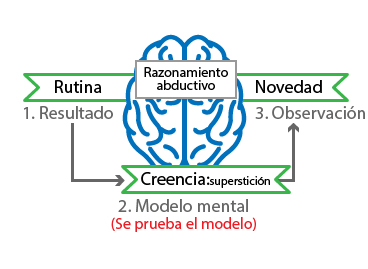 El razonamiento abductivo nunca pasa por la zona de aprendizaje. Las conclusiones que se infieren usando este tipo de razonamiento se basan en la superstición y generalmente son falsas. Se infiere por pensamiento abductivo cuando se presenta un resultado no deseado y se quiere indagar la causa para eliminarla. El problema con este tipo de razonamiento es que lo más probable es que no se identifique la causa primordial, sino efectos secundarios y que estos traten de eliminarse y además se fabriquen culpables sin que el problema se resuelva.