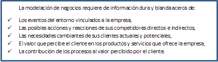 La modelación de negocios requiere de información dura y blanda acerca de: