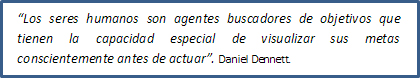 Según Daniel Dennett, un destacado filósofo estadounidense, los seres humanos atribuimos propósitos a todo: a los relojes, a las computadoras y a los seres vivientes. Entendemos a los demás en términos de “hacia dónde pensamos que se dirigen” y no en términos de “dónde pensamos que han estado”. A los agentes causales que aparentemente se mueven por sí mismos en la persecución de un estado futuro o del logro de una meta, les asignamos la propiedad de “buscadores de objetivos”.