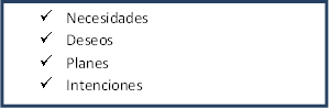 Todas las personas son buscadoras de objetivos y hacen planes para alcanzarlos. La agencia causal se acompaña de necesidades, deseos, planes e intenciones. Detrás de una necesidad siempre hay un deseo de saciarla: “Siento hambre y deseo comida”. El deseo es una imagen que describe las circunstancias futuras de una necesidad ya satisfecha: “un estómago lleno”, y produce en la mente un plan, en este caso para conseguir comida.