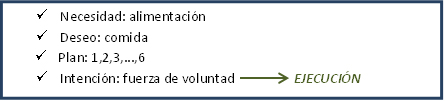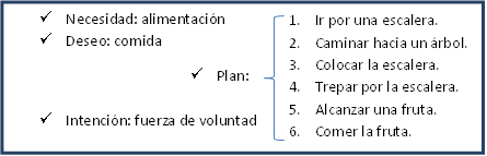 El plan que aparece en la mente con un intervalo significante antes de la acción, consta de una serie de pasos: ir por una escalera, caminar hacia un árbol, colocar la escalera, trepar por ella hasta alcanzar una fruta y comérsela. El plan se confecciona para resolver un conjunto de problemas de forma prospectiva con el fin de realizar el deseo, pero no se ejecuta mientras no aparezca la intención, esto es, la fuerza de voluntad, que motiva la acción.