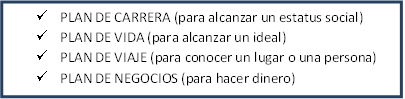 Hay muchos tipos de planes, por ejemplo, un plan de carrera para alcanzar un estatus social, un plan de vida para alcanzar un ideal, un plan de viaje para conocer un lugar, o un plan de negocios para hacer dinero. En todos hay un deseo.